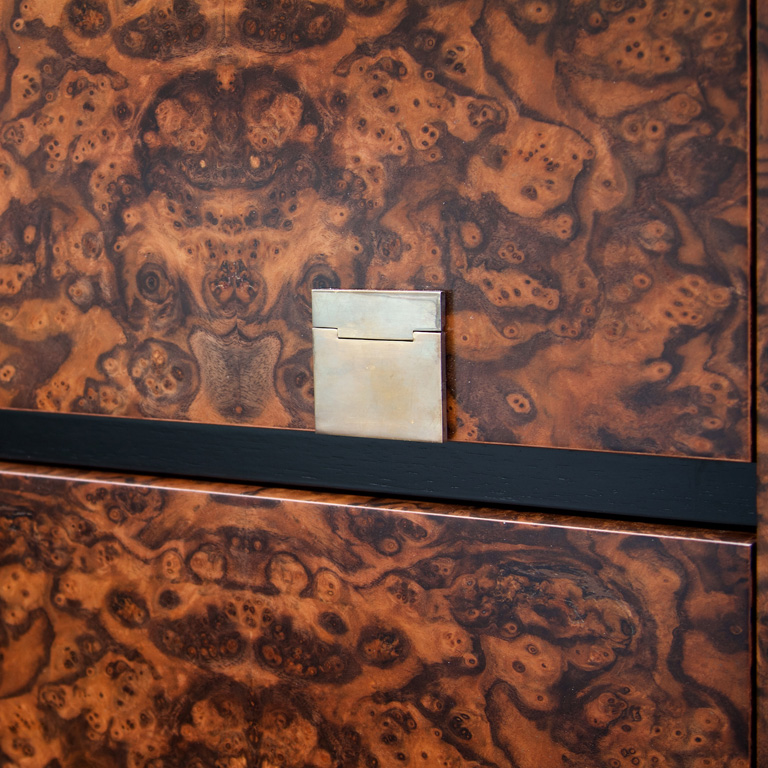 Burr Walnut, ebonised Blackwood. Aged Bronze flap handles.