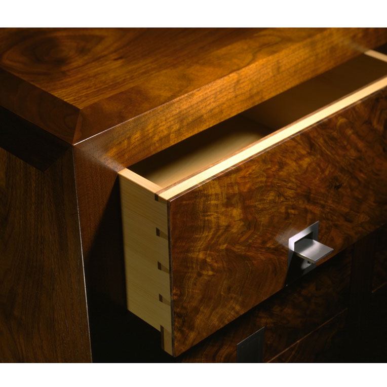 American Walnut, Burr Walnut, Celery Top Pine, with handmade Stainless Steel handles and feet.
