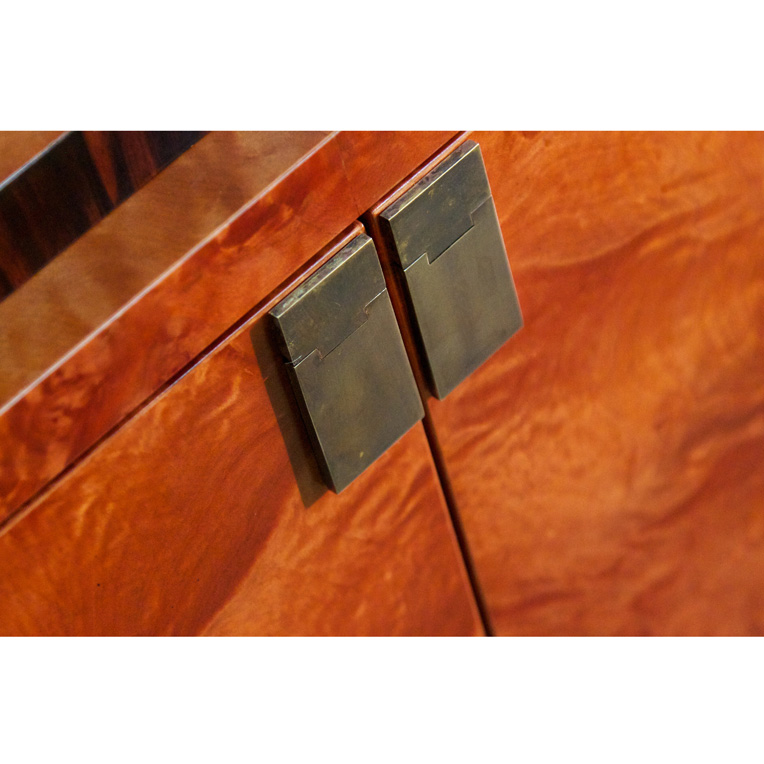 Stunning rare Burl Myrtle veneer is used for this contemporary, Art Deco inspired cabinet. Contrasting Ebony is used to highlight the top and base.