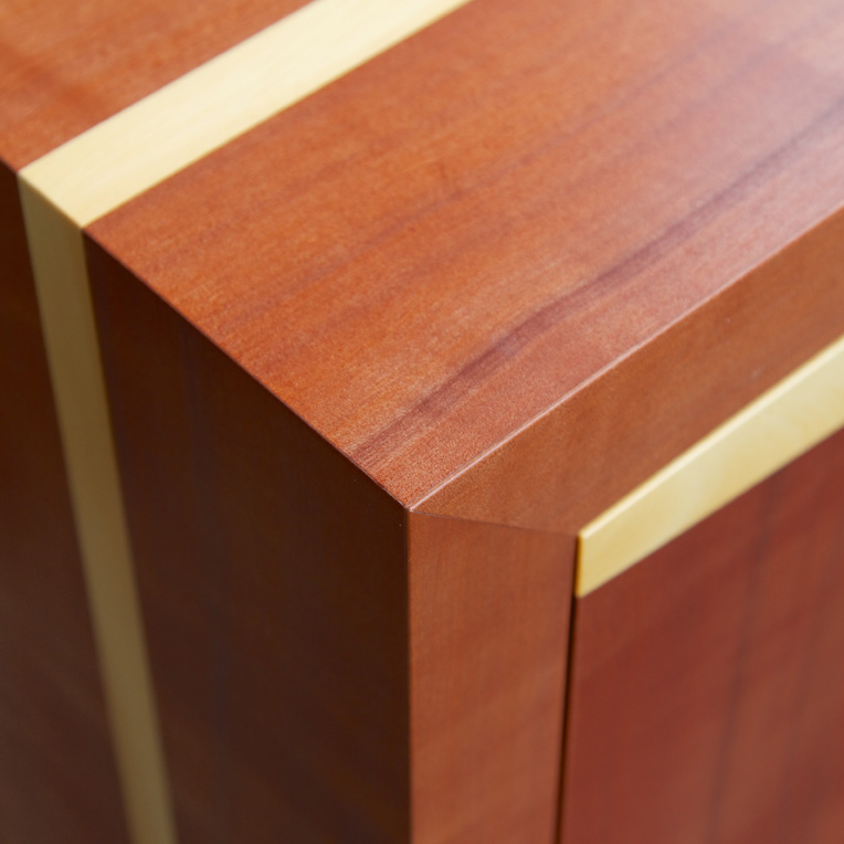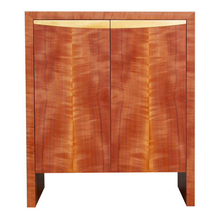 This cabinet was designed to fit into a small alcove in a hallway. Stunning Figured Tasmanian Myrtle is contrasted with a featured Huon Pine inlay detail. The doors are push to open, with an adjustable shelf behind.