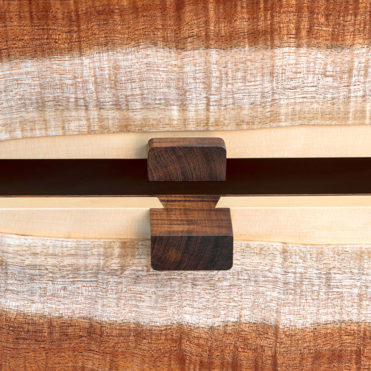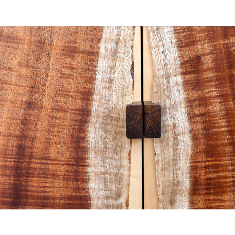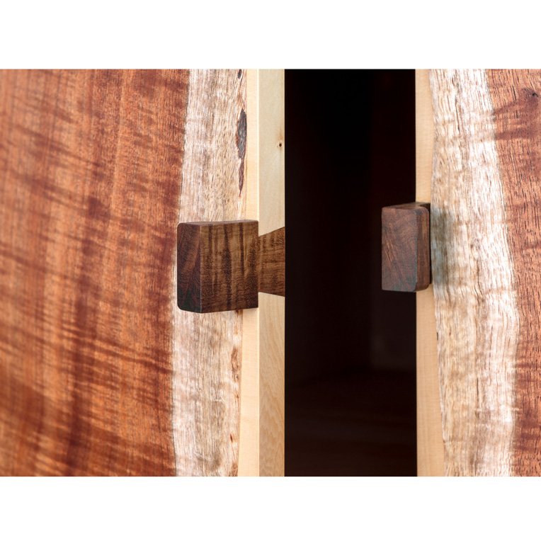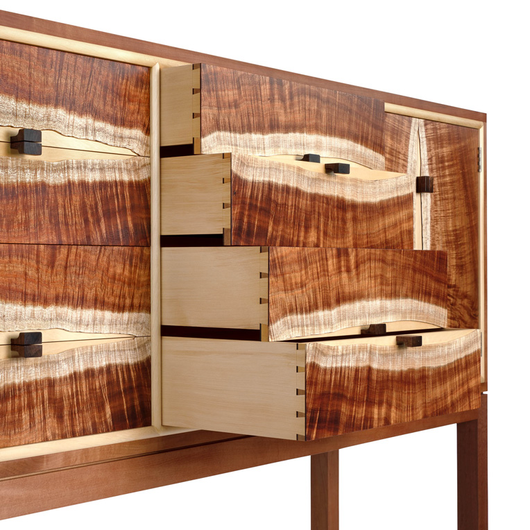 “This was the piece that first gave me the idea for The Anton Gerner Exhibition. Working without drawings (like all of the pieces in this exhibition) I started on this cabinet one Saturday in 2011. I sliced up some very special Fiddleback Blackwood and decided to contrast this with Huon Pine for the drawer fronts and doors.