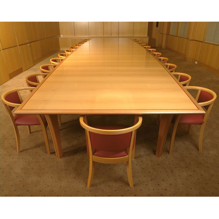 Designed to seat 24, this boardroom table and chairs was commissioned by Scotch College, Melbourne. The table top features bookmatched wide Beech veneer, with an inlay of Red Gum. The chairs are made from Solid Beech, with fine leather upholstery.