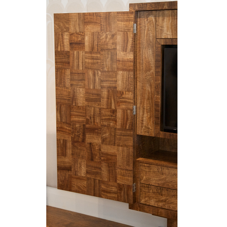 Originally designed as a media cabinet to hold Hi-Fi compontents and a TV, this cabinet can also be configured as a bar unit. The entire cabinet is made from stunning rare Fiddleback Blackwood from Tasmania. The front of the doors feature a full 32 segment sunburst pattern. The doors open to reveal a geometric patchwork design, also in Fiddleback Blackwod.