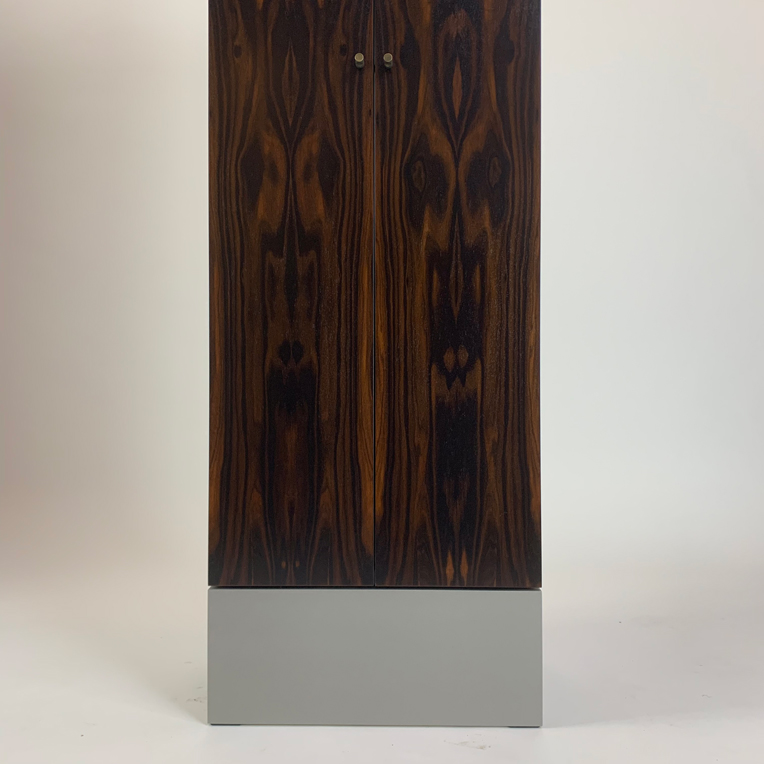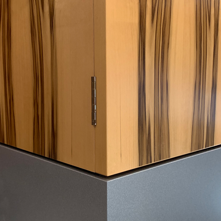 Sassafras, with Victorian Ash interior. Silky Oak, with Victorian Ash interior. Macassar Ebony, with Victorian Ash interior. Metallic paint finish to base, aged brass knobs.