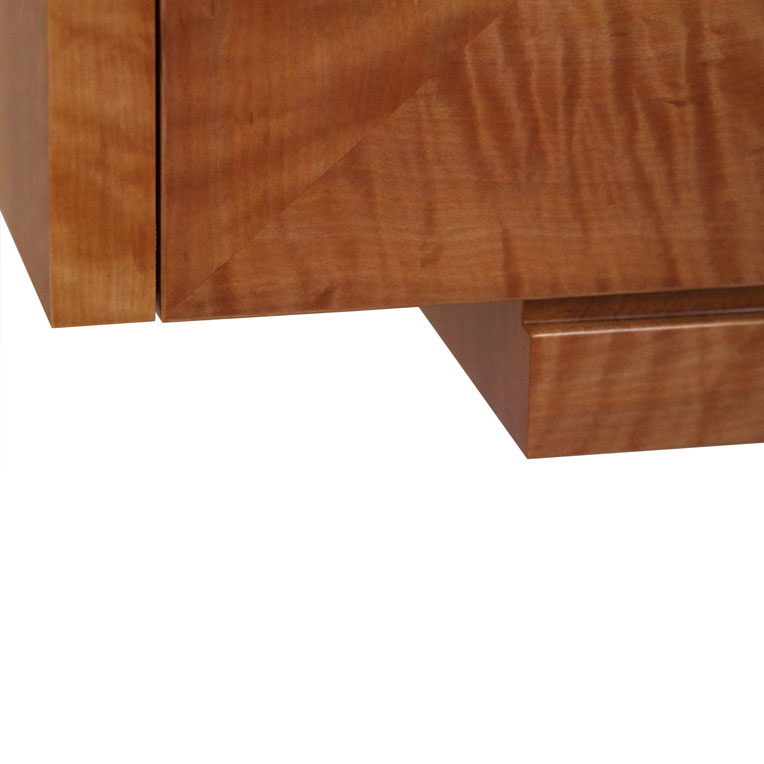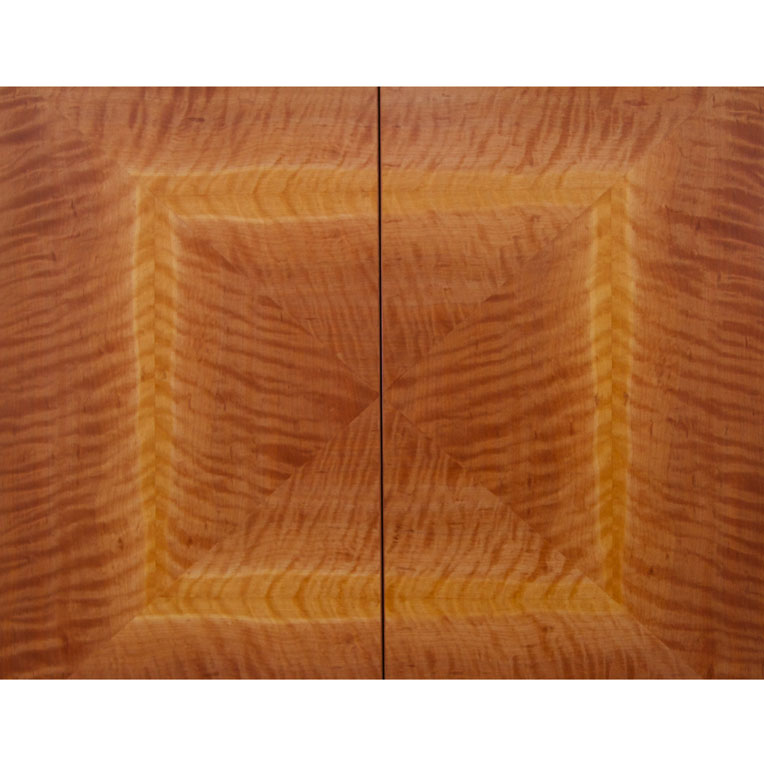 Highly figured veneer was chosen to create the quarter matched pattern on the front of this sideboard. The lighter streak in the grain becomes a feature. Push to open doors reveal adjustable shelving.